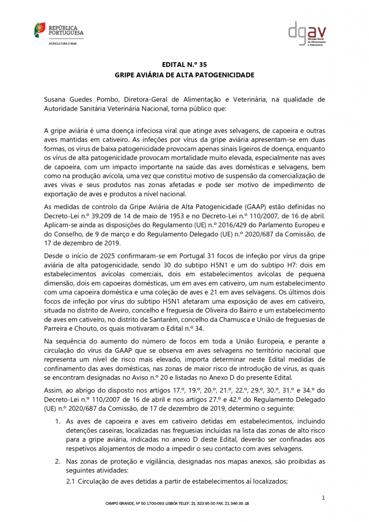 DGAV – Edital n.º 35 – Gripe Aviária de Alta Patogenicidade
