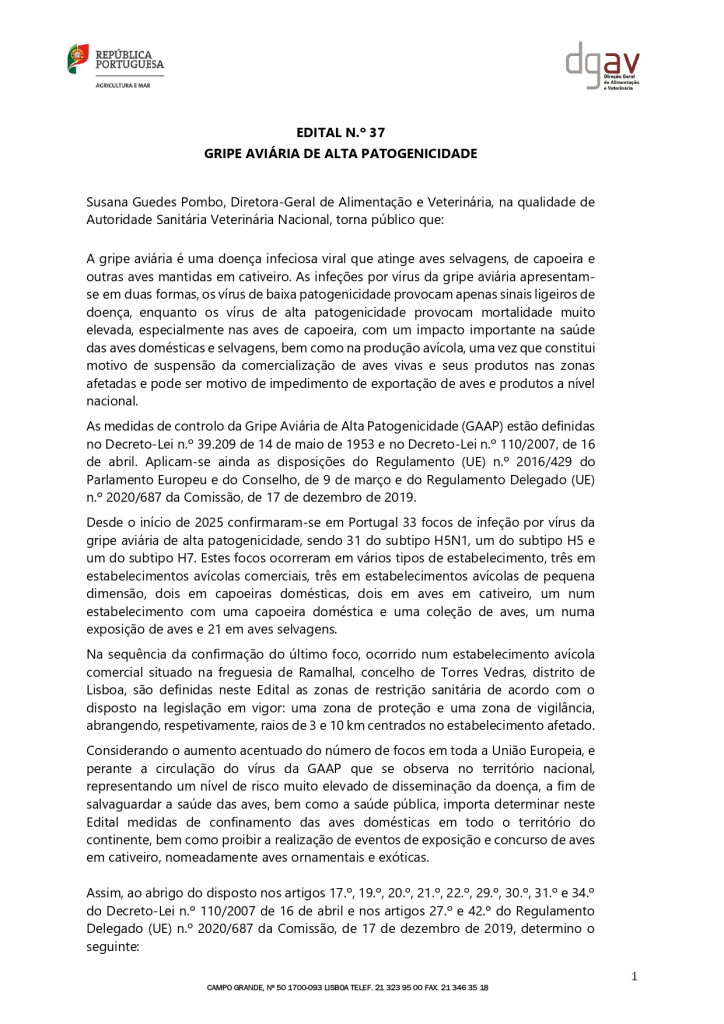 DGAV - Edital n.º 37 GAAP - Gripe Aviária de Alta Patogenicidade