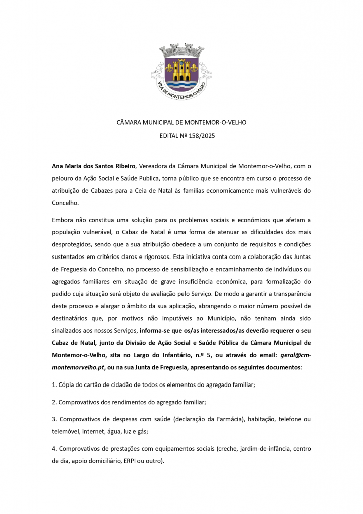 Edital n.º 158/2025 - Câmara Municipal de Montemor-o-Velho