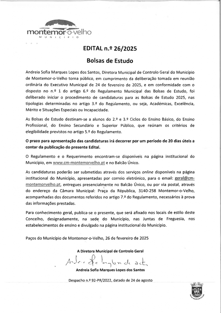 Bolsas de Estudo - Candidaturas abertas - Município de Montemor-o-Velho