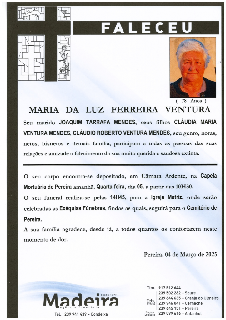 Falecimento da Srª. Maria da Luz Ferreira Ventura