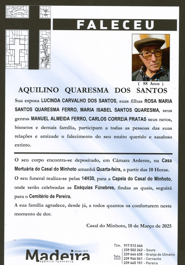 Falecimento do Sr. Aquilino Quaresma dos Santos