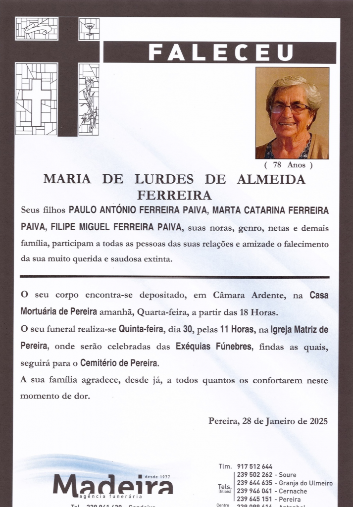 Falecimento da Srª. Maria de Lurdes de Almeida Ferreira