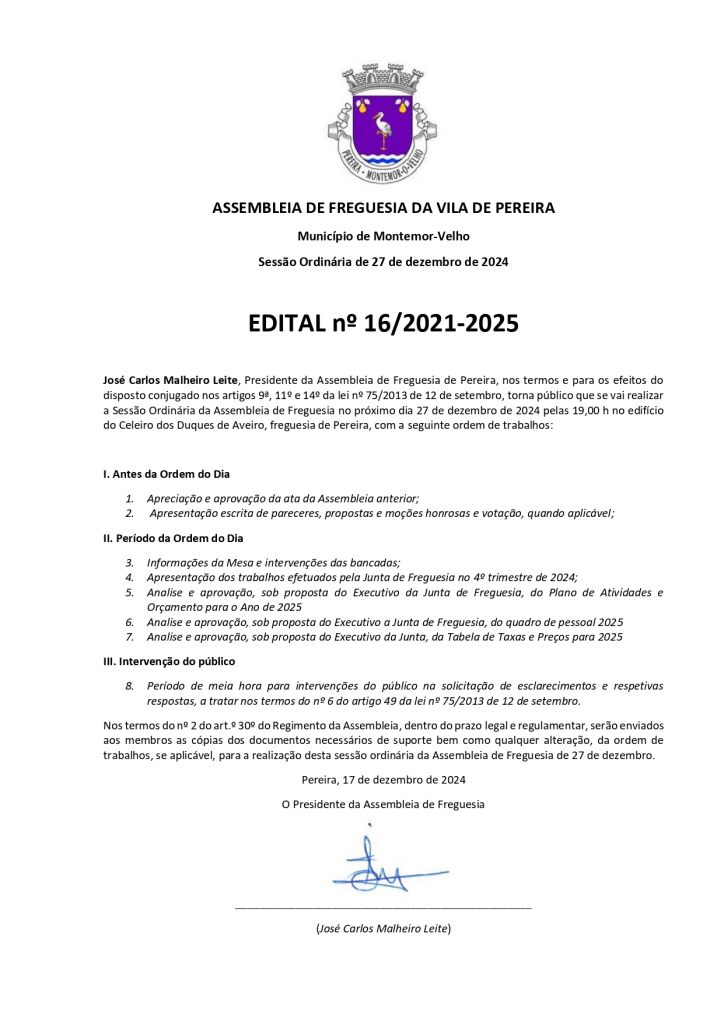 Edital n.º 16/2021-2025 – Assembleia de Freguesia da Vila de Pereira