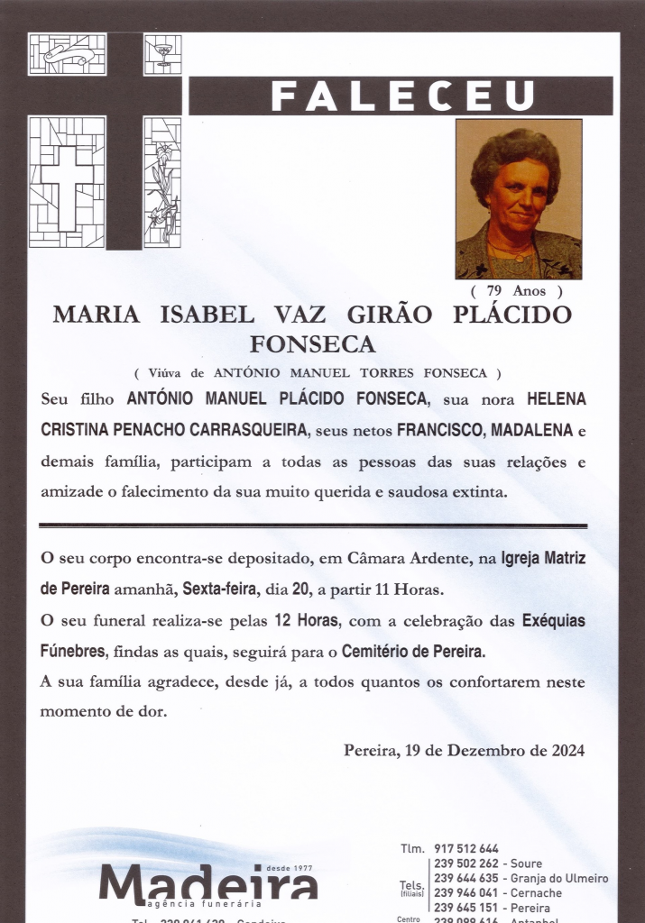 Falecimento da Srª. Maria Isabel Vaz Girão Plácido Fonseca