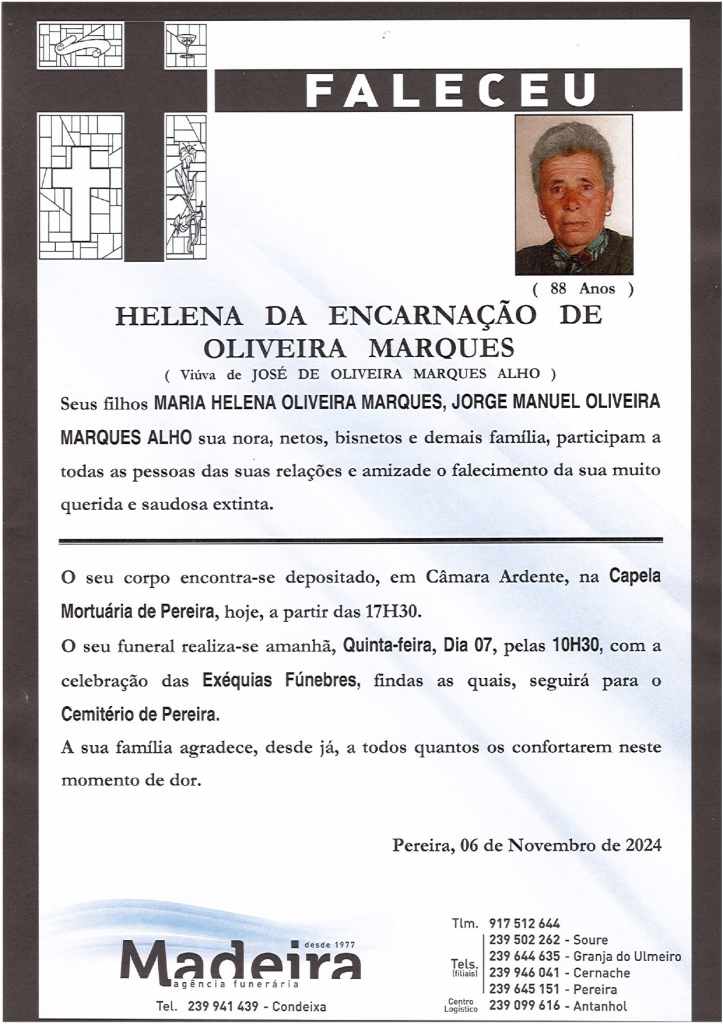Falecimento do Sr.ª Helena da Encarnação de Oliveira Marques