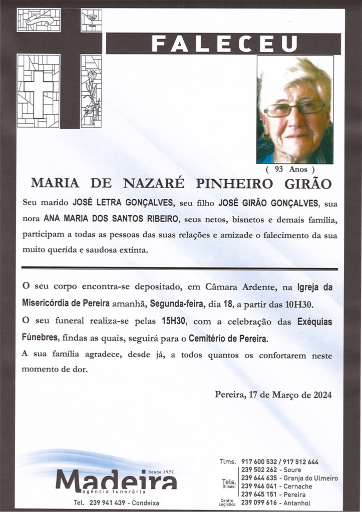 Falecimento da Sr.ª Maria de Nazaré Pinheiro Girão