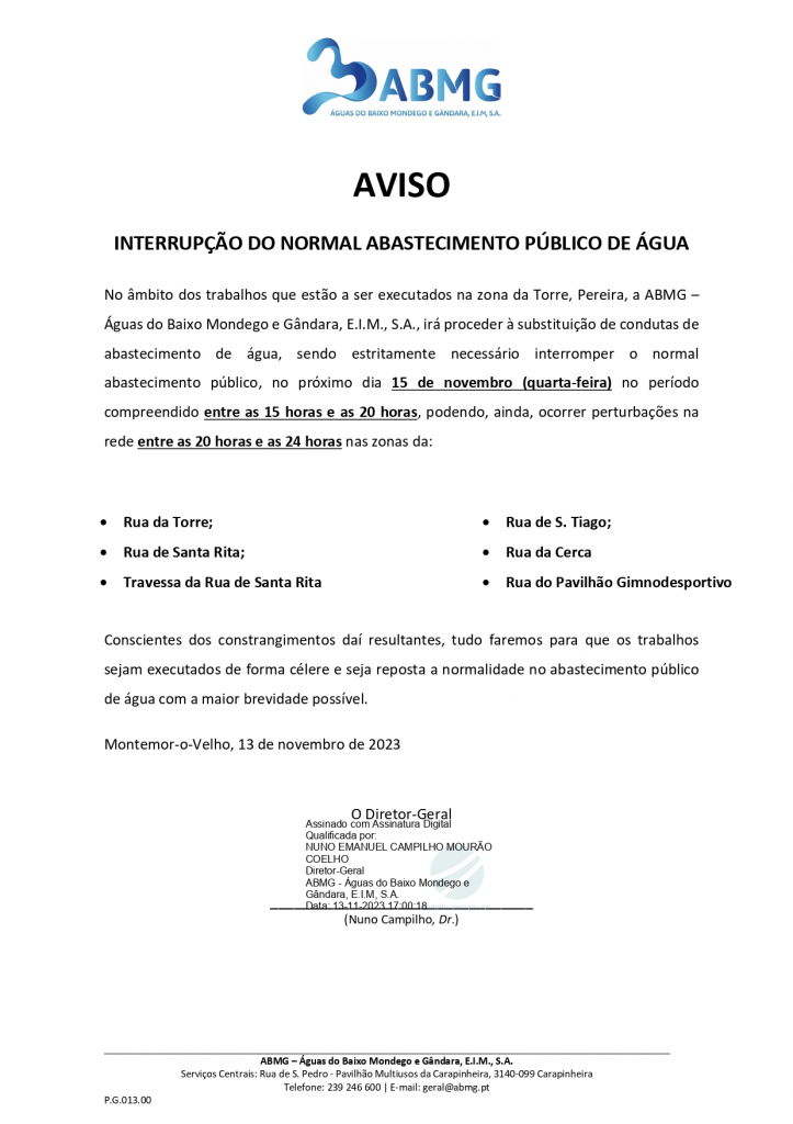 Aviso corte de Água - Pereira