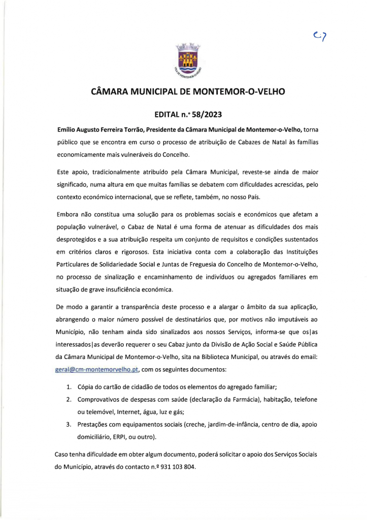Edital n.º 58/2023 - Atribuição de Cabazes de Natal