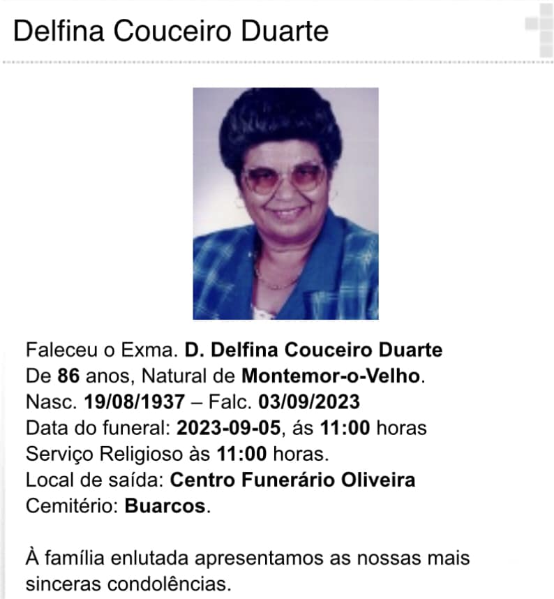 Falecimento da Sra. Delfina Couceiro Duarte