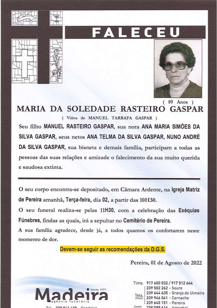 Falecimento da Sr.ª Maria da Soledade Rasteiro Gaspar