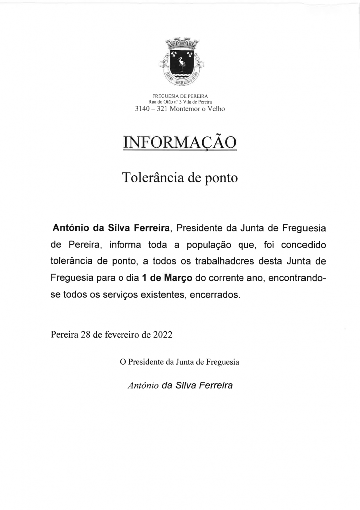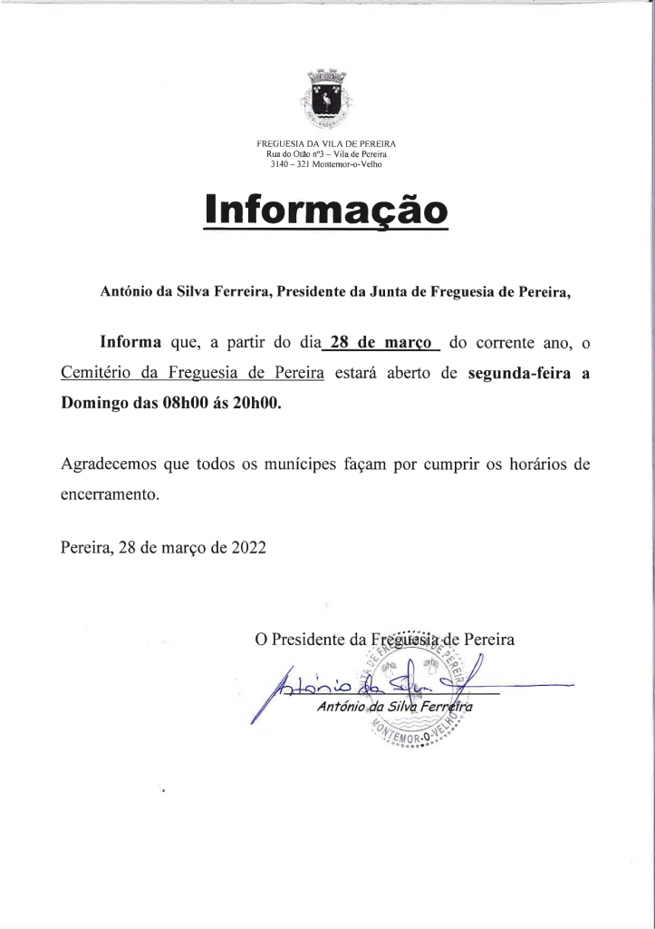 Informação - Novo horário Cemitério de Pereira