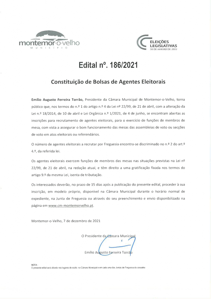 Edital n.º 186/2021 Constituição de Bolsas de Agentes Eleitorais
