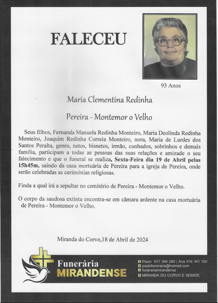Falecimento da Sr.ª Maria Clementina Redinha