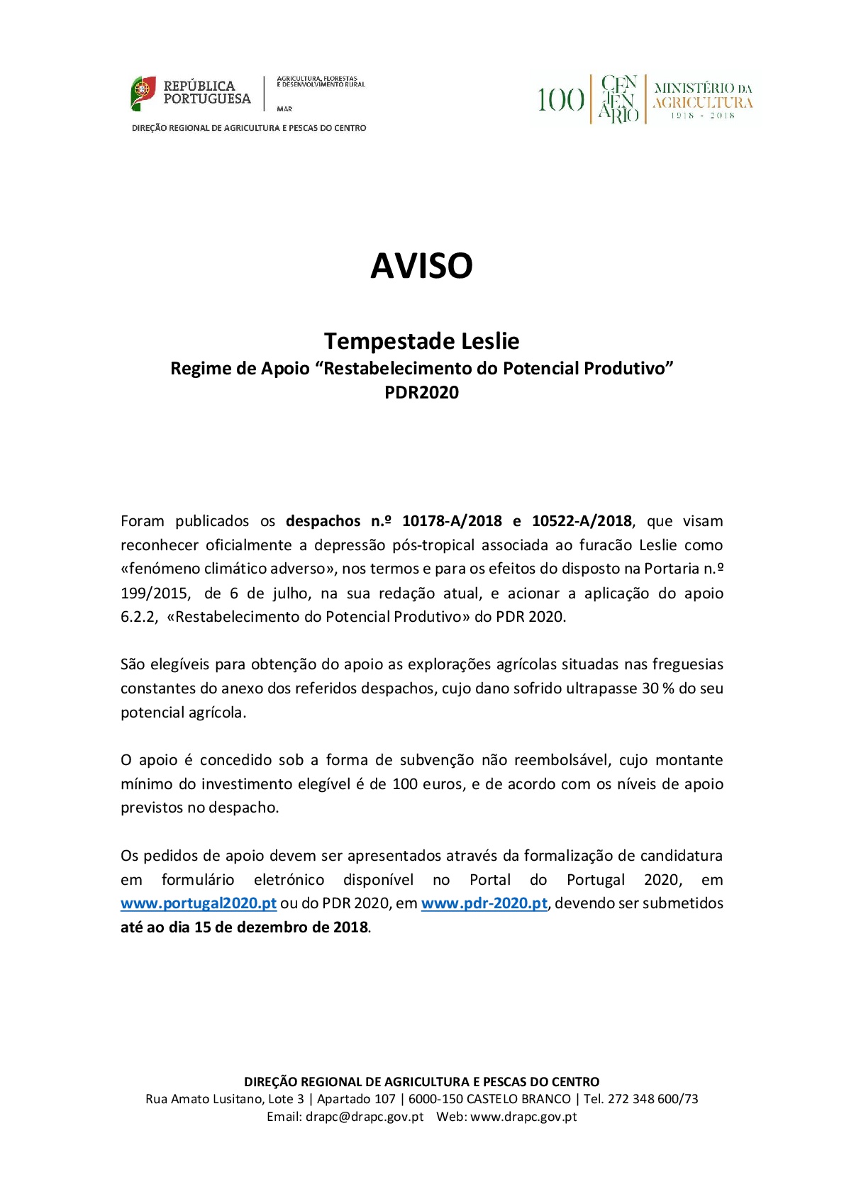 Tempestade Leslie - Regime de Apoio