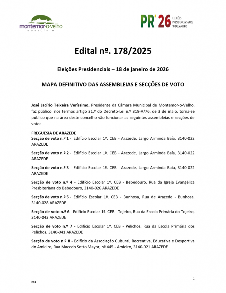 Edital n.º 178/2025 – Mapa definitivo das assembleias e secções de voto