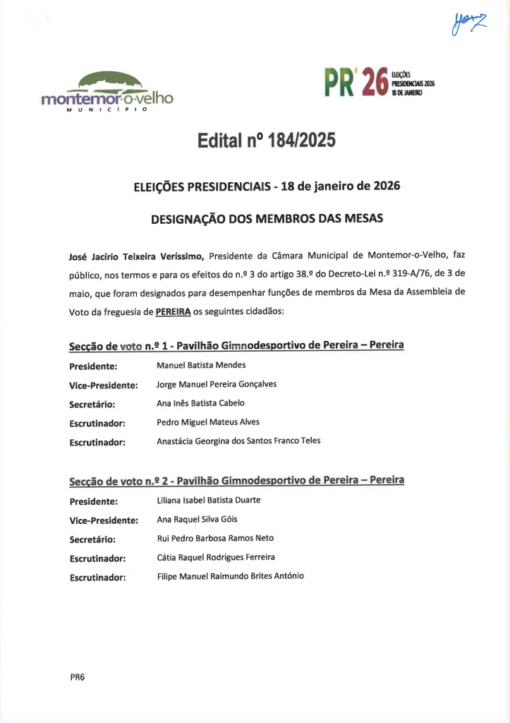 Edital n.º 184/2025 – Eleições Presidenciais - Designação dos membros das mesas